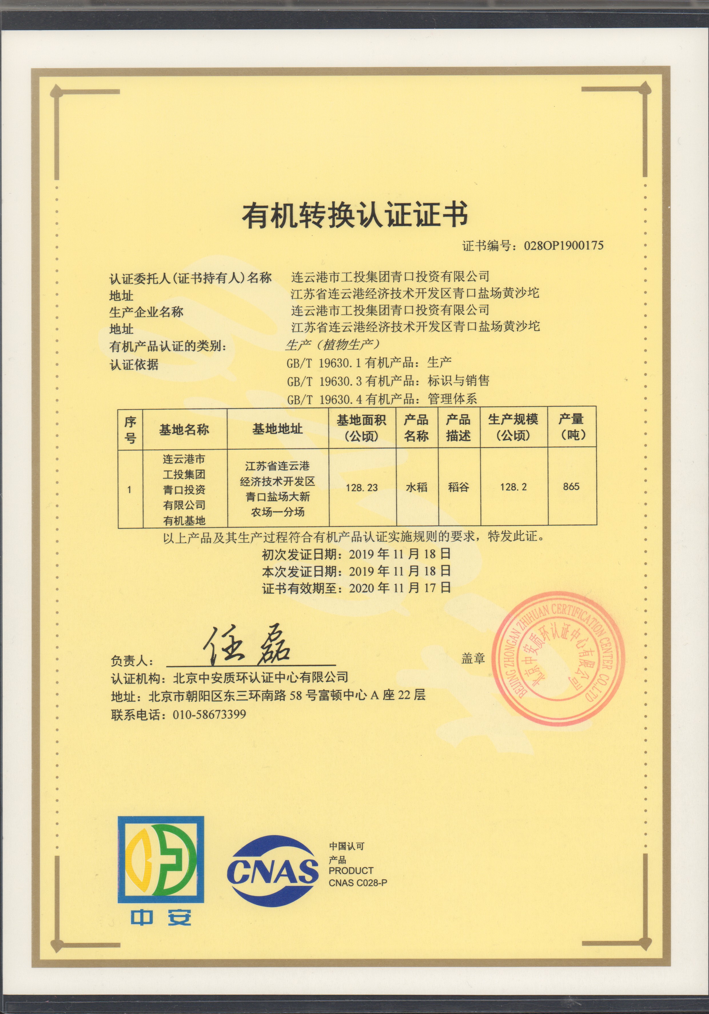 11月25日上午,青口投資公司種植的“南粳9108”有機大米經(jīng)過(guò)嚴格的檢測和審核,榮獲北京中安質(zhì)環(huán)認證中心頒發(fā)的有機轉換認證證書(shū)。