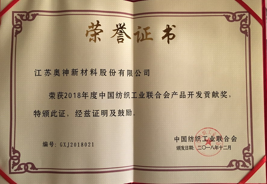 近日,在北京召開(kāi)的2018年中國紡織創(chuàng )新年會(huì )上,江蘇奧神新材料股份有限公司獲得中國紡織工業(yè)聯(lián)合會(huì )頒發(fā)的“2018年度中國紡織工業(yè)聯(lián)合會(huì )產(chǎn)品開(kāi)發(fā)貢獻獎”榮譽(yù)稱(chēng)號。