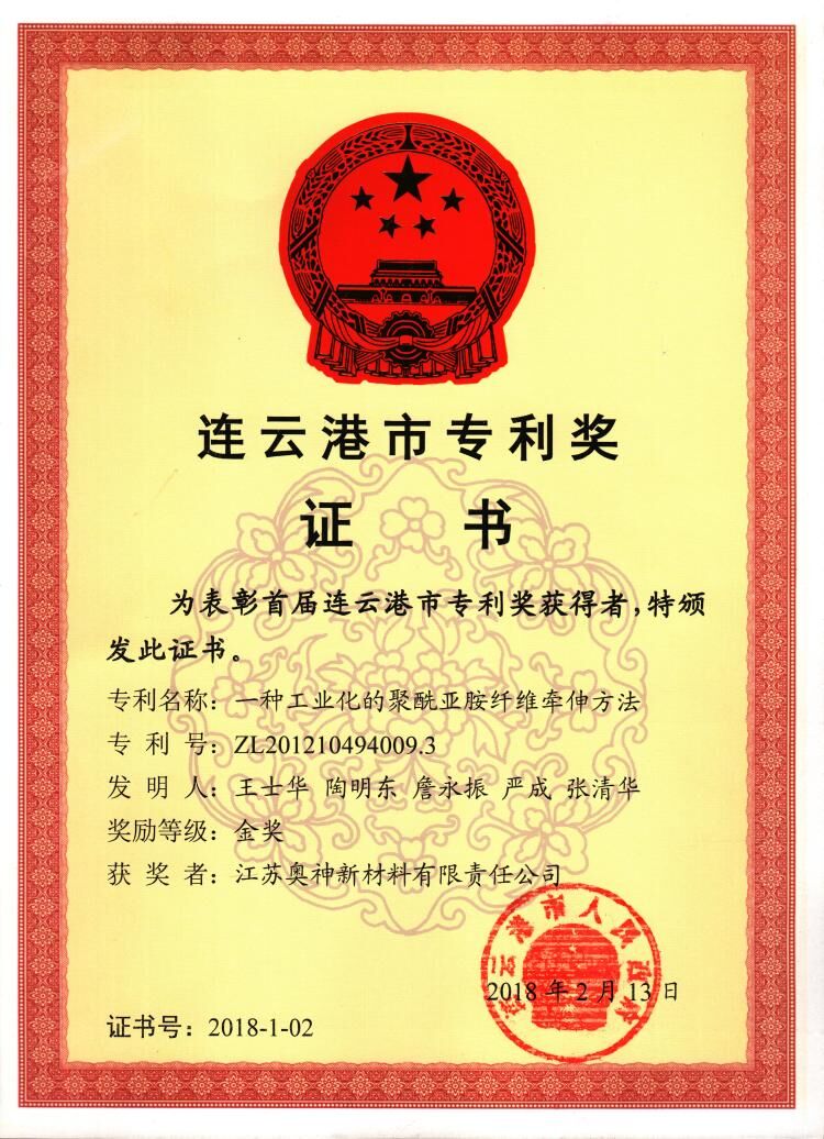 近日,連云港市政府發(fā)文,對首屆連云港市專(zhuān)利獎獲獎項目給予表彰,奧神新材料公司發(fā)明專(zhuān)利“一種工業(yè)化的聚酰亞胺纖維牽伸方法”獲得首屆連云港市專(zhuān)利金獎。據悉,本屆專(zhuān)利金獎?dòng)?/span>10項。