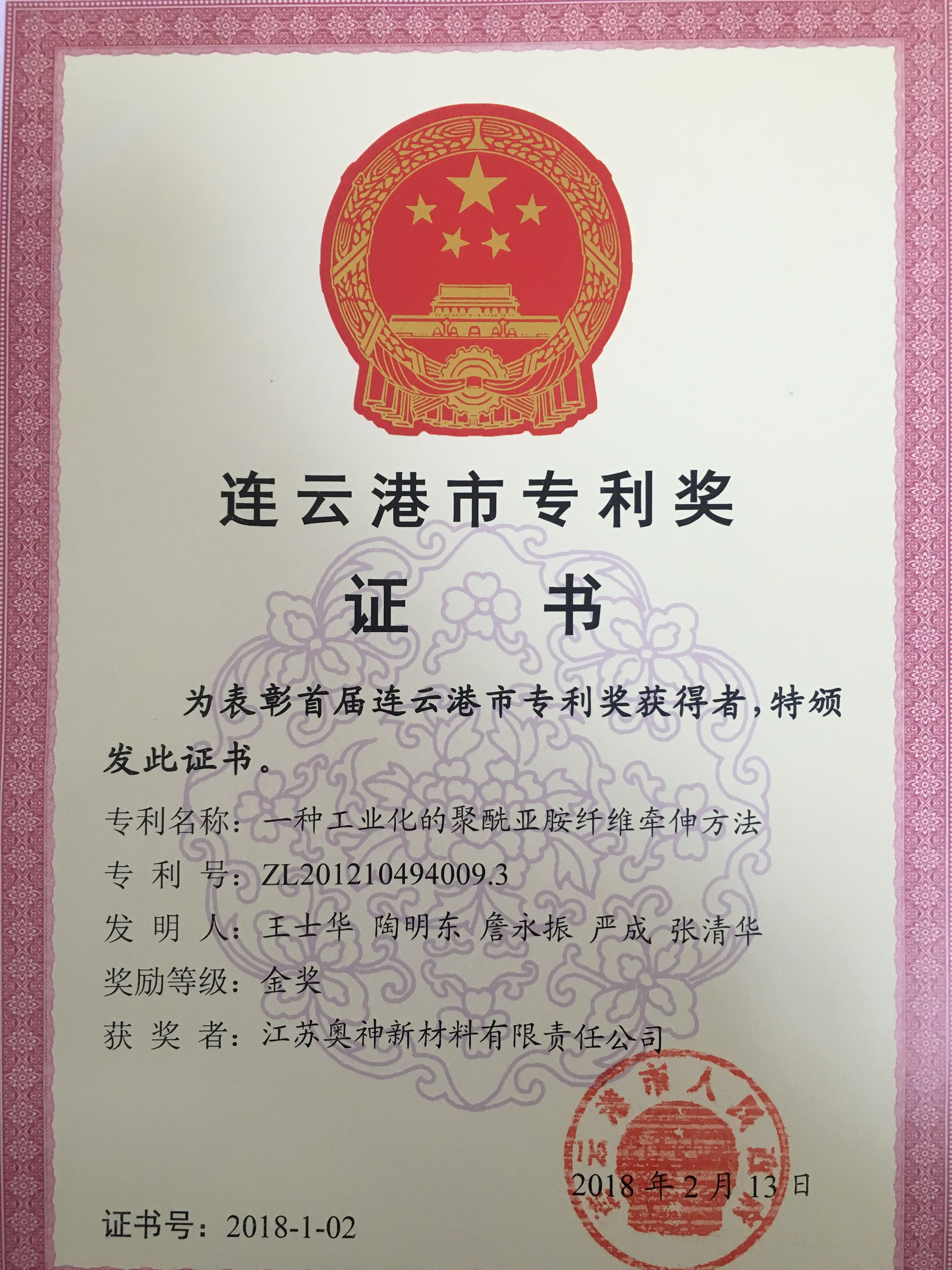 近日,奧神新材料公司“一種工業(yè)化的聚酰亞胺纖維牽伸方法”專(zhuān)利喜獲首屆連云港市專(zhuān)利獎金獎。