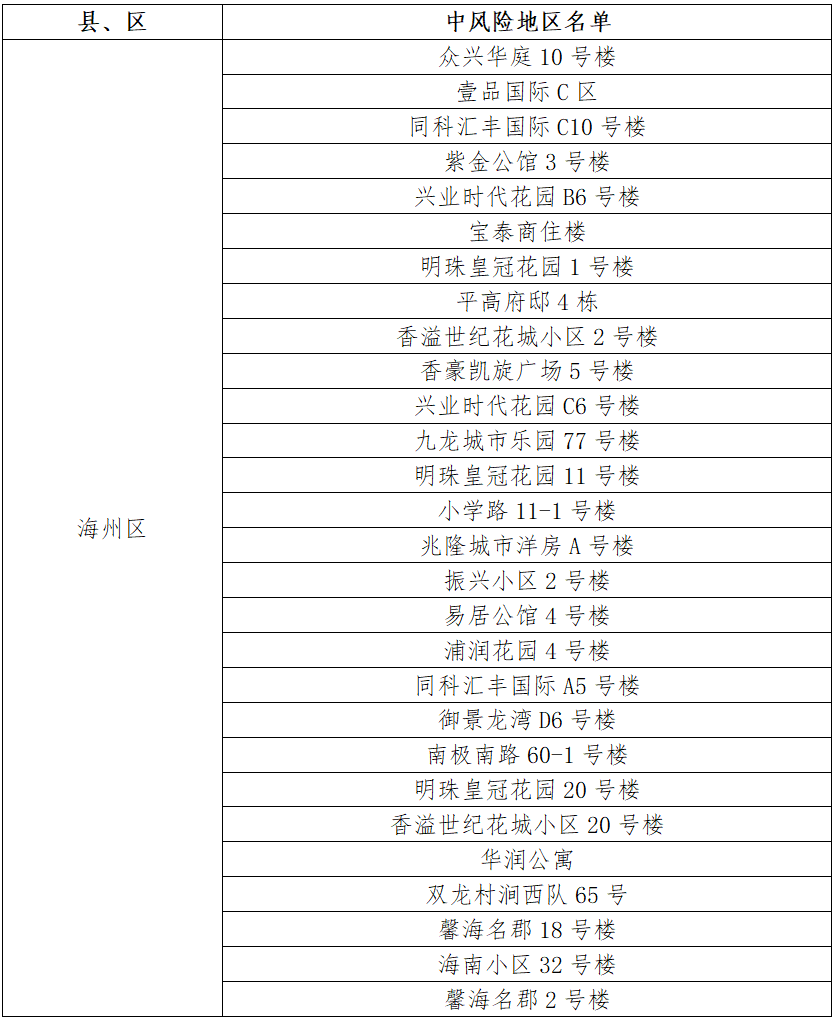 根據國務(wù)院聯(lián)防聯(lián)控機制有關(guān)規定,經(jīng)市指揮部研究決定,自發(fā)布之日起,對我市部分區域疫情風(fēng)險等級進(jìn)行調整:海州區天順國際花園7號樓、鳳凰名都10號樓、御景龍灣C1號樓、天順國際花園11號樓、御景龍灣A4號樓、香溢江南小區12號樓、同科匯豐國際A2號樓、平高書(shū)香名邸1號樓、香溢江南小區7號樓、西門(mén)村楊鳳莊21號、鳳凰名都9號樓、園林村白虎山小區78號樓、江化北路82-5號、金色大漠、平高書(shū)香名邸4號樓、朐陽(yáng)街道花園路1號、制藥巷5-114、萬(wàn)潤泰和苑4號樓由中風(fēng)險地區調整為低風(fēng)險地區。其他地區風(fēng)險等級不變。調整后全市現有28個(gè)中風(fēng)險地區。