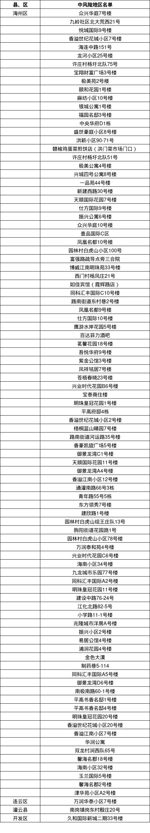 海州區潤琦苑3號樓、天景美地4號樓、溫僑綠苑B2由中風(fēng)險地區調整為低風(fēng)險地區。