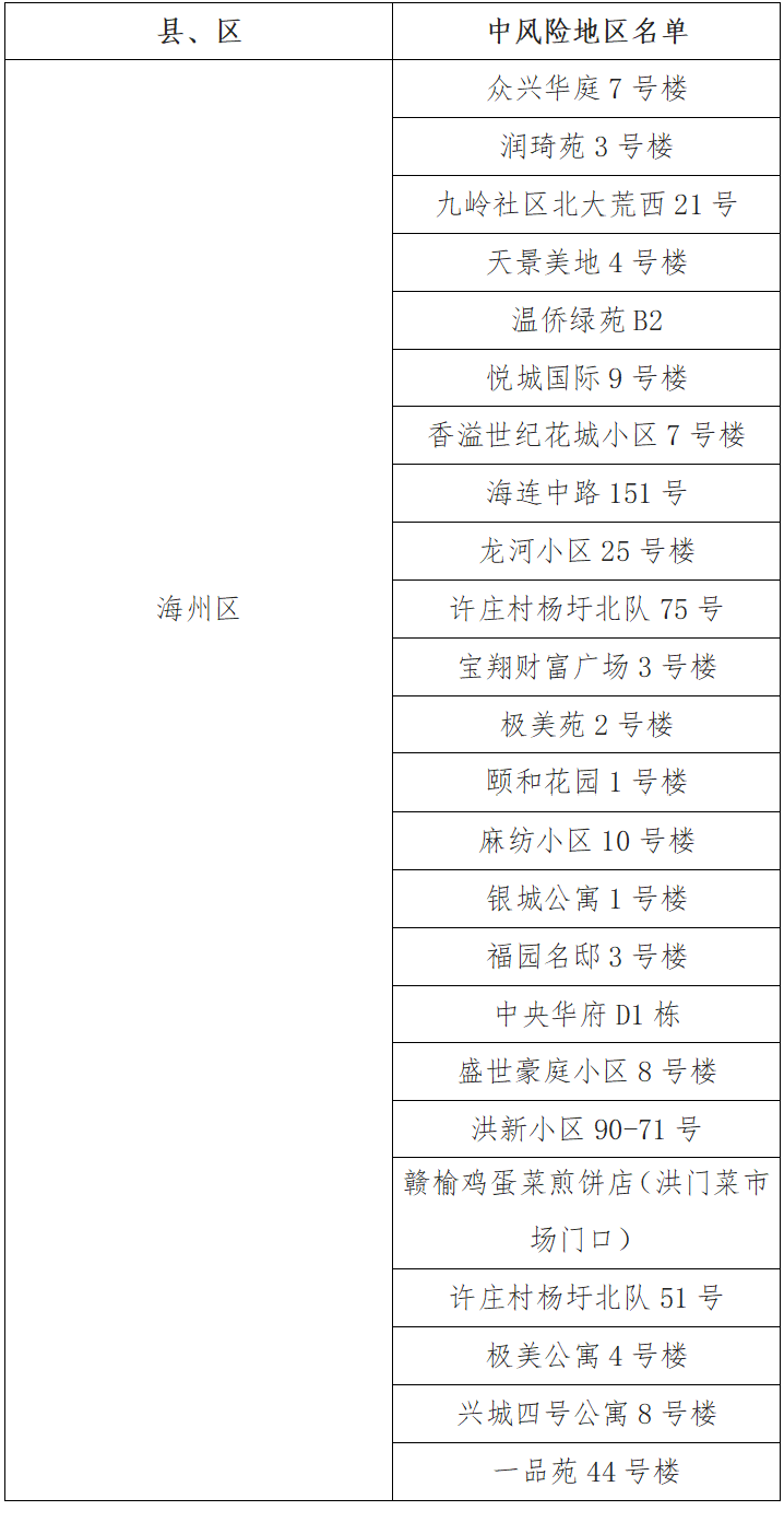 根據國務(wù)院聯(lián)防聯(lián)控機制有關(guān)規定,經(jīng)綜合評估研判,市指揮部決定,自發(fā)布之日起,將頤和花園1號樓、麻紡小區10號樓、銀城公寓1號樓、福園名邸3號樓、中央華府D1棟、盛世豪庭小區8號樓、洪新小區90-71號、贛榆雞蛋菜煎餅店(洪門(mén)菜市場(chǎng)門(mén)口)、許莊村楊圩北隊51號、極美公寓4號樓、興城四號公寓8號樓、一品苑44號樓調整為中風(fēng)險地區。其他地區風(fēng)險等級不變。調整后全市現有24個(gè)中風(fēng)險地區。