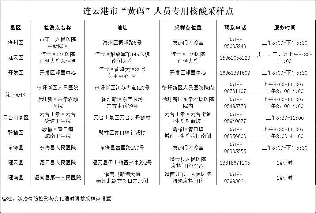 與確診病例或無(wú)癥狀感染者活動(dòng)軌跡有時(shí)空伴隨人員。 1. 賦“黃碼”人員,應居家健康監測7天,并到指定機構進(jìn)行3次核酸檢測(第 1、3、7天,每次間隔24小時(shí)),如果檢測結果均為陰性,統一轉為“綠碼”。符合轉碼條件未能自動(dòng)轉碼的“黃碼”人員,憑相關(guān)證明向所在地社區(村)、街道(鄉鎮)登記,并提出申請,由屬地縣(區)疾控中心安排專(zhuān)人負責審核,并負責轉“綠碼”事宜。 2. 如市民發(fā)現“黃碼”賦碼不準確,可及時(shí)向所在社區(村)報告、登記,由社區(村)匯總至所在街道(鄉鎮)后提供給屬地縣(區)疾控中心進(jìn)行審核,并負責轉“綠碼”事宜。 “黃碼”人員請主動(dòng)向所在社區(村)登記,遵守相關(guān)防疫規定,到指定“黃碼”專(zhuān)用采樣點(diǎn)進(jìn)行核酸采樣檢測。全程嚴格做好個(gè)人防護,不乘坐公共交通工具,與他人保持1米安全距離。請市民密切關(guān)注個(gè)人健康狀況,做到少出門(mén)、不串門(mén)、不扎堆、不聚集,出現發(fā)熱、咳嗽、乏力、腹瀉等新冠肺炎疑似癥狀第一時(shí)間報告。 附件:連云港市“黃碼”人員專(zhuān)用核酸采樣點(diǎn)連云港市突發(fā)新冠肺炎疫情應急處置指揮部辦公室