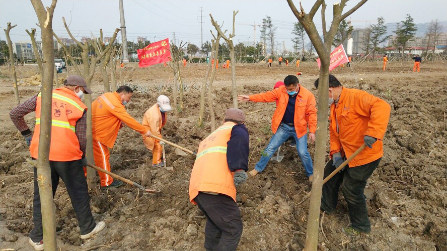 為保證植樹(shù)質(zhì)量,該公司配備多名專(zhuān)業(yè)技術(shù)人員進(jìn)行全程技術(shù)指導。上午8時(shí)許,在移苗現場(chǎng),一臺挖掘機轟隆隆地作業(yè)著(zhù),小心翼翼的將一棵棵大樹(shù)苗連根拔起,在保證不擠壓的情況下,輕抬輕放,裝苗運輸。在栽苗活動(dòng)現場(chǎng),全體工作人員戴好頭罩、手套等防護用具,在統一指揮下,彼此間隔1米左右,擼起袖子、揮著(zhù)鐵鍬、扛著(zhù)鋤頭飛快地投入到栽苗植樹(shù)作業(yè)中。大家分工協(xié)作,有的開(kāi)槽挖坑;有的栽植樹(shù)苗;有的抬木扶苗;有的回填新土;有的纏繩護樹(shù);有的澆水保濕……到處都是忙碌的身影,整個(gè)植樹(shù)活動(dòng)現場(chǎng)一片熱火朝天的繁忙景象。放眼望去,在明媚的春光中,一排排新栽下的樹(shù)苗迎風(fēng)挺立,生機勃勃,組成了一道道靚麗的風(fēng)景線(xiàn)。