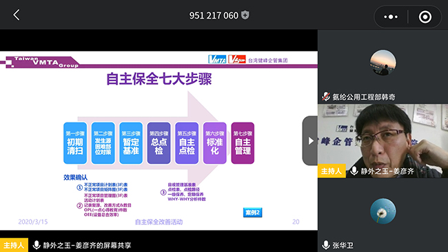 近日,氨綸公司全面落實(shí)疫情防控與復工復產(chǎn)“兩手抓”。疫情當前,為了避免培訓人員集聚,公司采取網(wǎng)絡(luò )授課的方式開(kāi)展培訓,組織廣大職工開(kāi)展了線(xiàn)上TPM培訓活動(dòng)。