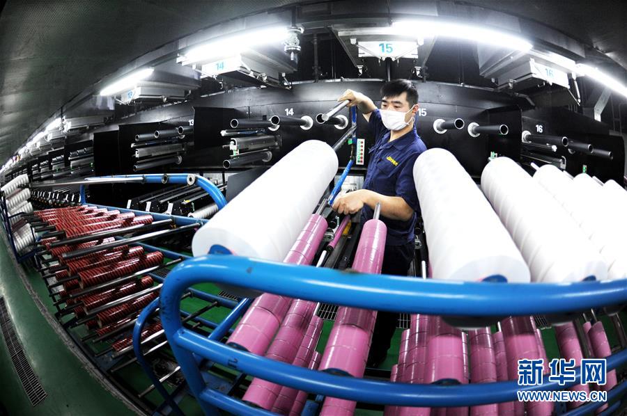 3月2日,工人在江蘇連云港開(kāi)發(fā)區杜鐘氨綸車(chē)間生產(chǎn)線(xiàn)上忙碌。(王春 攝)