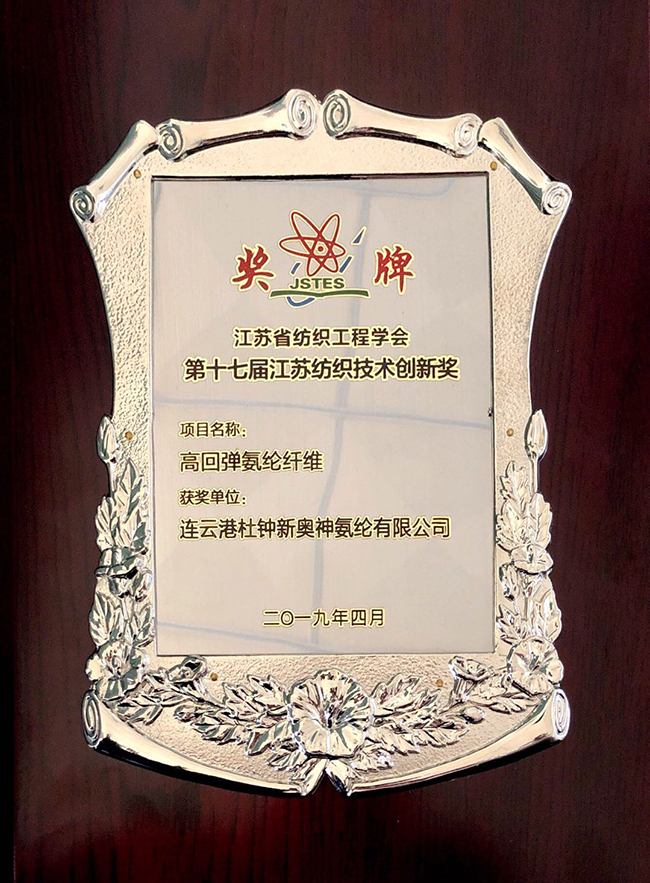 近日,經(jīng)企業(yè)申報、有關(guān)單位推薦和專(zhuān)家評審等流程,我公司高新技術(shù)產(chǎn)品“高回彈氨綸纖維”項目獲得第十七屆江蘇紡織技術(shù)創(chuàng )新獎。氨綸公司將以此為契機,大力弘揚“創(chuàng )業(yè)、創(chuàng )新、創(chuàng )優(yōu),爭先、領(lǐng)先、率先”的新時(shí)代江蘇精神,為建設強富美新江蘇和紡織強國作出新的貢獻。
