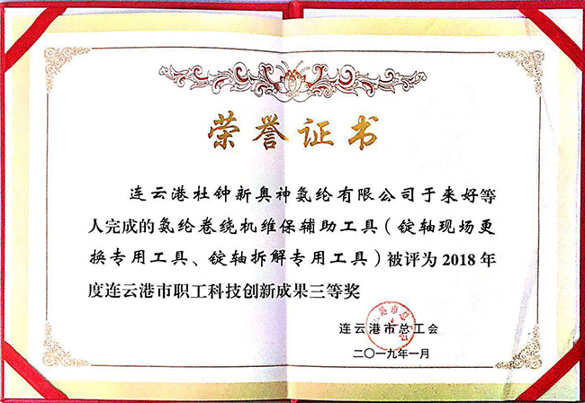 氨綸公司生產(chǎn)設備部卷繞機維修班組于來(lái)好同志發(fā)明的氨綸卷繞機維保輔助工具(其中錠軸現場(chǎng)更換專(zhuān)用工具和錠軸拆解專(zhuān)用工具)被市總工會(huì )評為“2018年度連云港職工科技創(chuàng )新成果三等獎。”