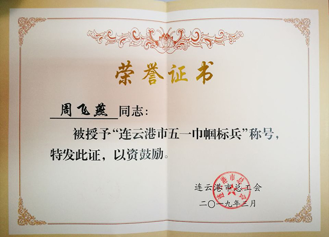 熱烈祝賀我公司市場(chǎng)開(kāi)發(fā)部周飛燕同志被連云港市總工會(huì )授予“連云港市五一巾幗標兵”榮譽(yù)稱(chēng)號。