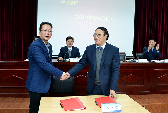會(huì )議共六項議程:奏國歌;總經(jīng)理張斌作《工作報告》;審議通過(guò)相關(guān)方案和意見(jiàn);對2018年度優(yōu)秀集體和個(gè)人進(jìn)行表彰;簽訂《2019年集體合同》;職工代表作表態(tài)發(fā)言。