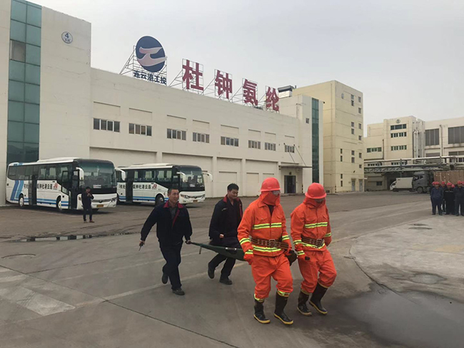 演練模擬DCS甬道上出口溫度報警,員工發(fā)現險情立即呼叫紡絲當班班長(cháng),紡絲控制室和組件進(jìn)行初步處置后,發(fā)現卷繞間出現明火爆燃,紡絲班長(cháng)報告消控中心并進(jìn)行現場(chǎng)應急處置。公司啟動(dòng)應急預案,應急行動(dòng)組、現場(chǎng)控制組、后勤保障組各司其職,隔離現場(chǎng)、應急救援、疏散人員。后在消防人員的協(xié)助下,大火被成功撲滅,并成功救助一位傷員。演練中,全體參演人員,精神飽滿(mǎn),恪盡職守,動(dòng)作規范,各部門(mén)通力合作,演練達到了預期,取得圓滿(mǎn)成功。