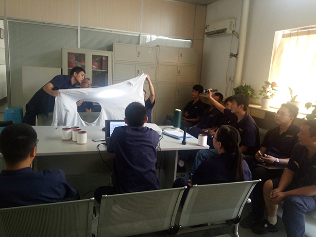產(chǎn)品質(zhì)量是企業(yè)的生命線(xiàn),氨綸公司致力于不斷完善售后服務(wù),暢通信息渠道,第一時(shí)間將用戶(hù)體驗中發(fā)現的問(wèn)題反饋到生產(chǎn)一線(xiàn)予以解決。2018年9月4日,技術(shù)部會(huì )同生產(chǎn)部門(mén)相關(guān)人員開(kāi)展了一場(chǎng)別開(kāi)生面的產(chǎn)品質(zhì)量投訴交流會(huì ),共同研討客戶(hù)投訴反饋的信息,從生產(chǎn)過(guò)程的每一個(gè)環(huán)節入手尋求解決方案。