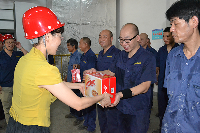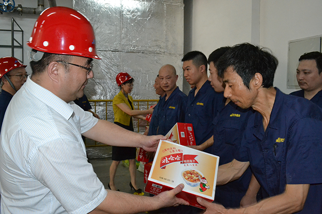 7月17日上午,集團公司董事長(cháng)楊龍、紀委書(shū)記汪群一行來(lái)氨綸公司慰問(wèn)奮戰在高溫下的一線(xiàn)員工,為他們送去綠豆、牛奶、八寶粥、解暑藥等防暑降溫慰問(wèn)品。在詳細詢(xún)問(wèn)了防暑降溫各項保障工作的落實(shí)情況后,楊龍董事長(cháng)叮囑大家要合理安排工作時(shí)間,避開(kāi)高溫時(shí)段,確保身體健康和安全生產(chǎn)。氨綸公司總經(jīng)理張斌、副書(shū)記王克平陪同慰問(wèn)。