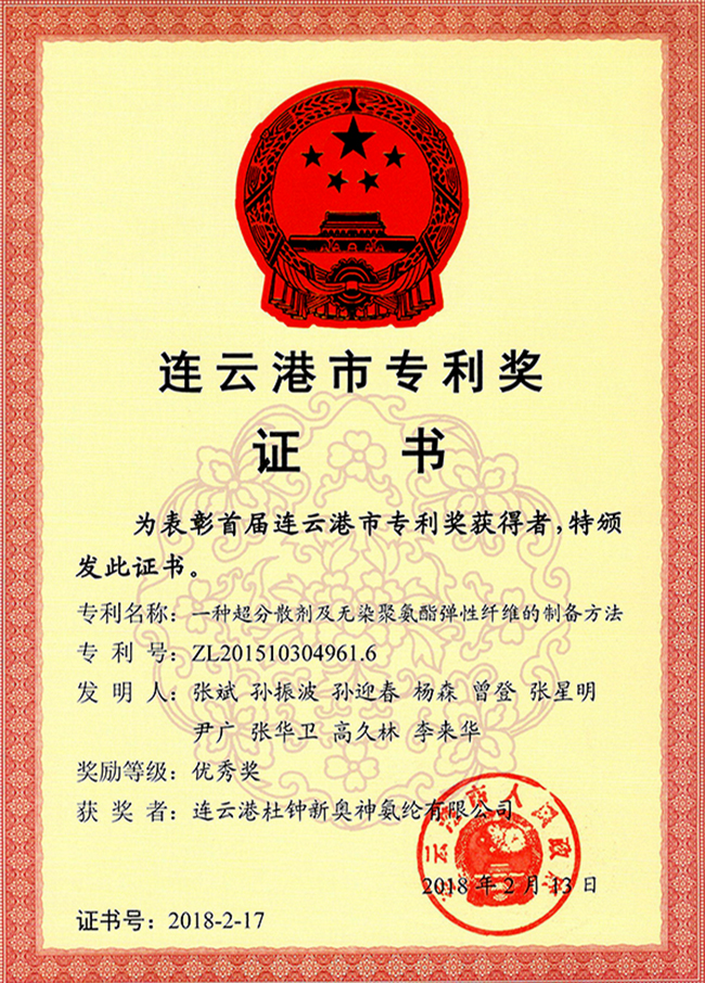 近日,氨綸公司“一種超分散劑及無(wú)染聚氨酯彈性纖維的制備方法”發(fā)明專(zhuān)利(專(zhuān)利號:ZL201510304961.6)獲得首屆連云港市專(zhuān)利優(yōu)秀獎。 據悉,本屆市專(zhuān)利獎共有30項專(zhuān)利獲獎,包括10項金獎, 20項優(yōu)秀獎。