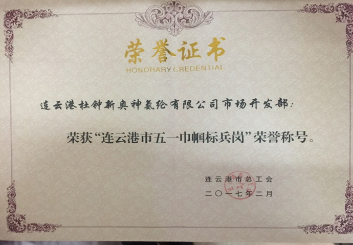 在集團公司的指導關(guān)心下,連云港杜鐘新奧神氨綸有限公司市場(chǎng)開(kāi)發(fā)部團結一致、攻堅克難,在市場(chǎng)開(kāi)拓方面做出了突出貢獻。經(jīng)連云港市總工會(huì )評選,榮獲“連云港市五一巾幗標兵崗”榮譽(yù)稱(chēng)號。