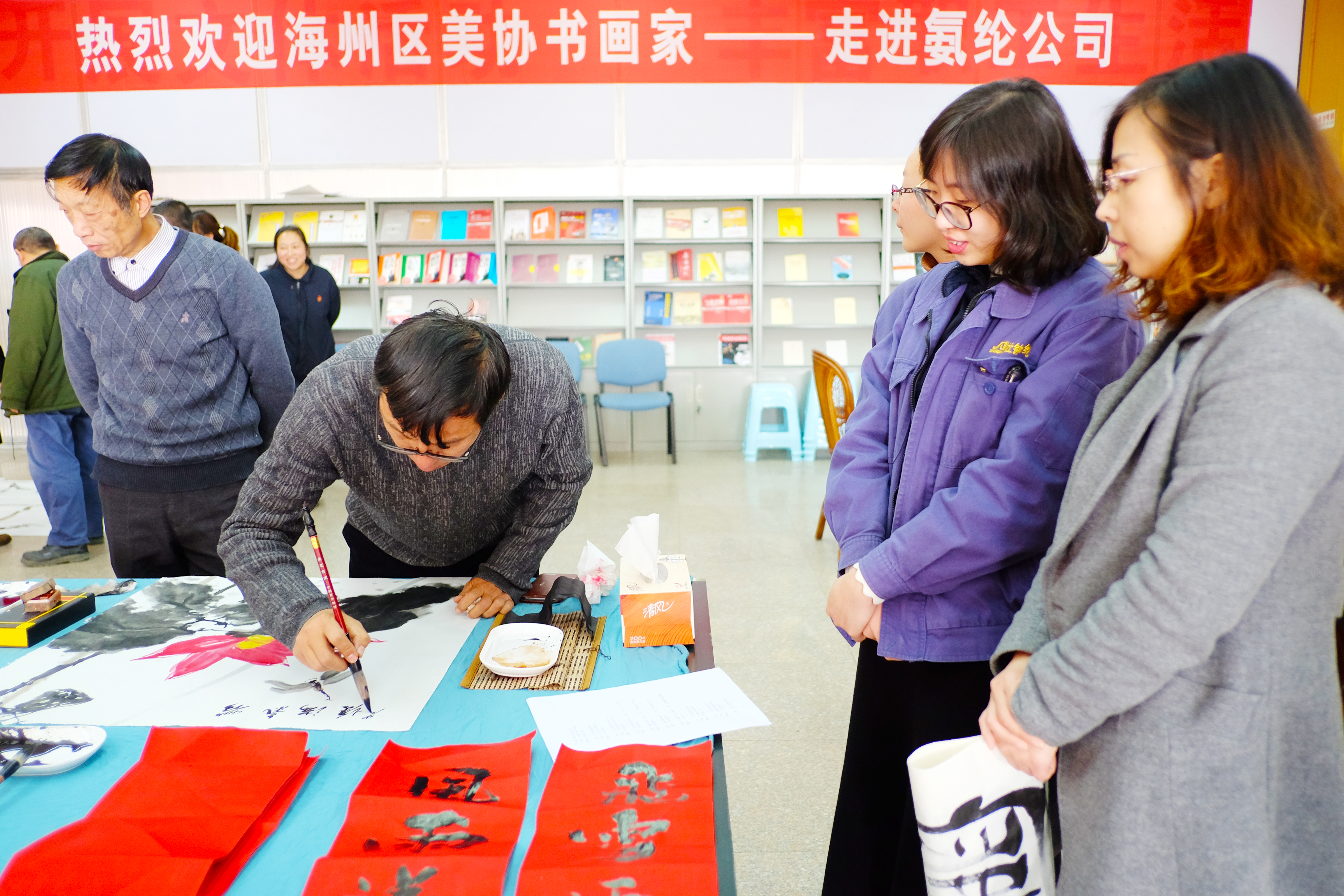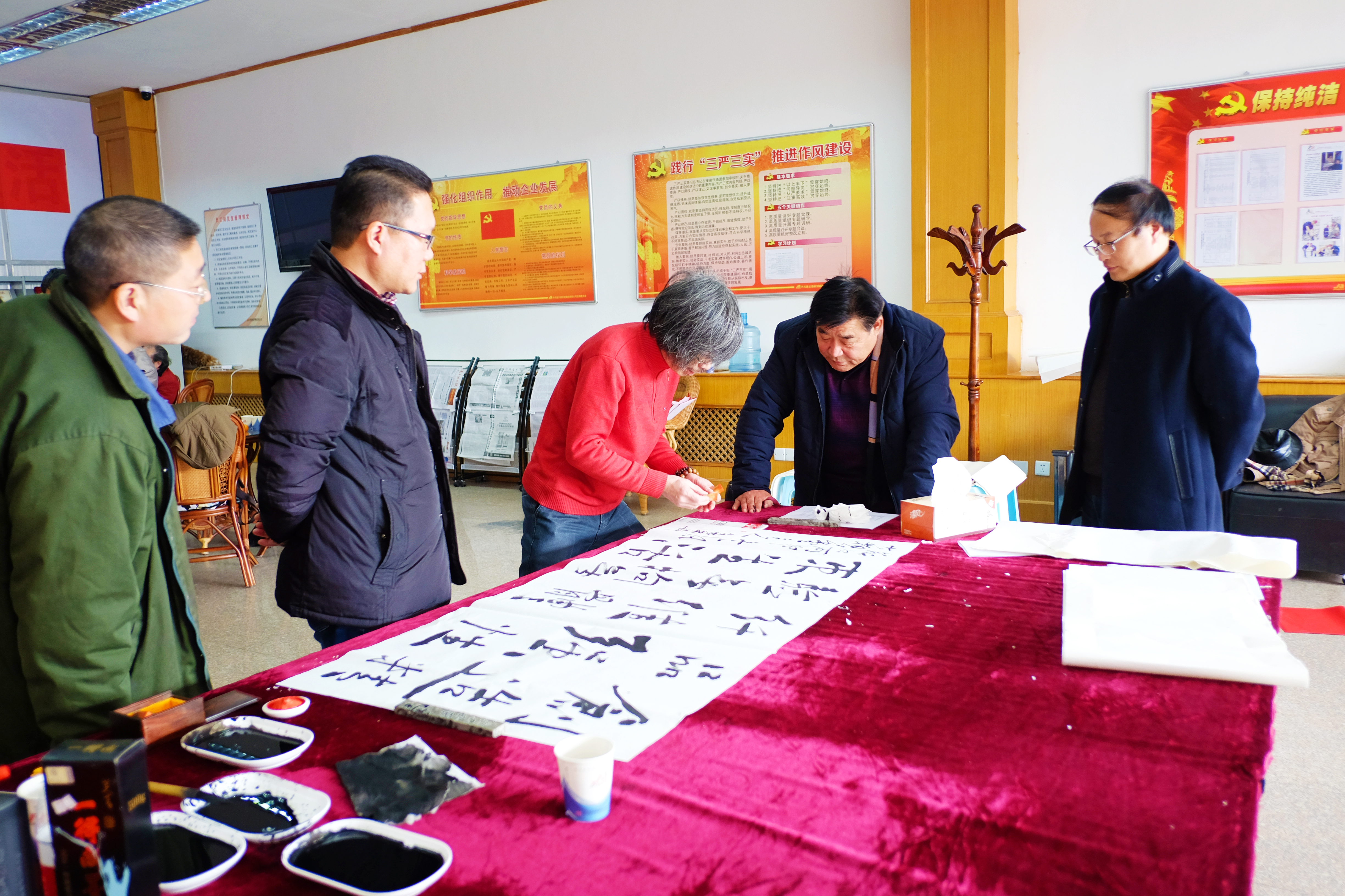 元旦、春節將至,為營(yíng)造和諧喜慶的節日氣氛,不斷提升企業(yè)文化品位氛圍,12月30日,海州區美術(shù)協(xié)會(huì )7位書(shū)畫(huà)大師受邀赴我公司潑墨獻寶。我司幾位書(shū)法愛(ài)好者也同場(chǎng)競技學(xué)習,豐富了員工的文化生活。
