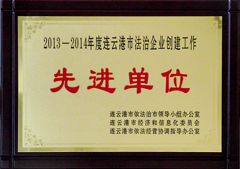 10月29日連云港杜鐘新奧神氨綸有限公司在全市深化法治企業(yè)創(chuàng )建工作推進(jìn)會(huì )上榮獲“2013-2014年度連云港市法治企業(yè)創(chuàng )建工作先進(jìn)單位”光榮稱(chēng)號,系全市30家獲獎單位之一。