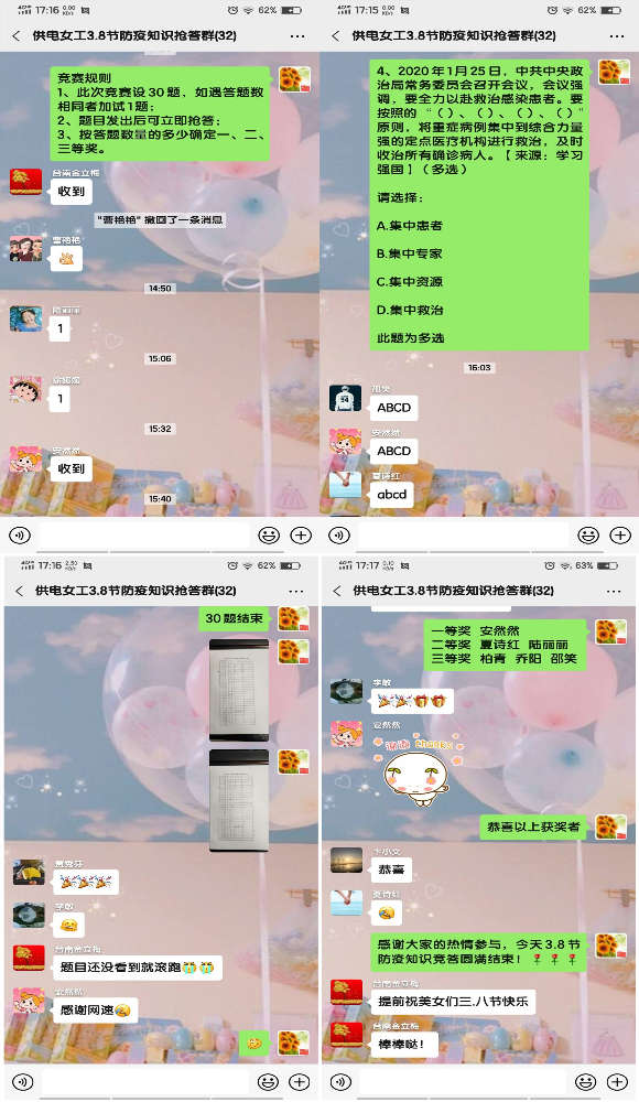 “準備好了么,搶答馬上開(kāi)始了。”3月6日下午4點(diǎn)整,女職工們或面對電腦或手持手機,為搶答賽做著(zhù)準備。隨著(zhù)搶答賽的開(kāi)始,在一題又一題的搶答中,雖然隔著(zhù)網(wǎng)絡(luò ),但是大家答題的激烈、緊張的氣氛好似都要穿透手機和電腦溢出屏幕。隨著(zhù)三十道搶答題的結束,根據參賽職工的搶答速度與正確率最終決出了一、二、三等獎。眾志成城防疫情,春意濃濃慶三八,線(xiàn)上網(wǎng)絡(luò )答題點(diǎn)燃了女職工們濃濃的節日氛圍。(電工)