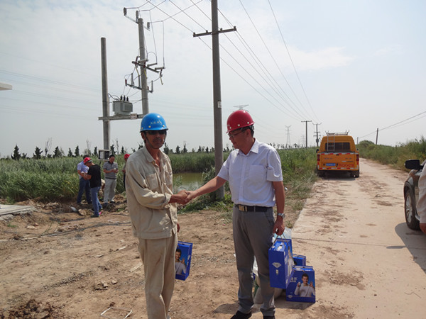 近日,中午天氣持續高溫炎熱,公司經(jīng)理孫政權、工會(huì )主席王志軍、副經(jīng)理袁慶國等領(lǐng)導,于9月1日上午,來(lái)到灌西供電所施工現場(chǎng)看望慰問(wèn)一線(xiàn)職工,并給他們送去了食品、飲料等慰問(wèn)品。