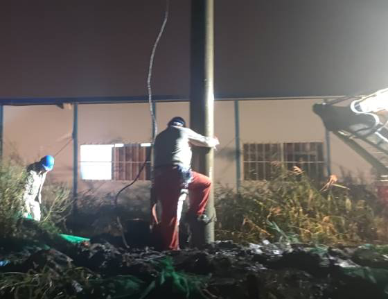 今年的10月天氣還是熱的厲害,電桿被太陽(yáng)曬的滾燙,搶修人員臉上掛滿(mǎn)了豆大的汗珠,工作服已經(jīng)全部濕透。為了搶時(shí)間,抓進(jìn)度,作業(yè)人員們全然不顧,依然緊張有序地工作著(zhù)?,F場(chǎng)搶修工作涉及吊車(chē)、挖掘機等大型施工機具,安全管控尤為重要,現場(chǎng)所有搶修人員在工作負責人的指揮下平穩有序的推進(jìn)搶修工作,吊車(chē)擺放位置、挖掘機挖桿洞的位置等每一個(gè)關(guān)鍵工作點(diǎn)都在搶修人員的嚴格監督下進(jìn)行,不敢有絲毫松懈。就在這時(shí),天公不作美,突然下起了大雨,可是大雨并沒(méi)有攔住搶修工作。臺北供電所現場(chǎng)所有的搶修人員在錢(qián)所長(cháng)的帶領(lǐng)下,穿著(zhù)濕透的工作服在雨中指揮挖掘機開(kāi)挖桿洞、組立電桿、連接導線(xiàn)-------搶修人員在天昏地暗的雨中穿梭,雨水和汗水交匯在電力搶修人員的臉龐上,大家都來(lái)不急擦拭一下臉上的雨水,在雨中忙碌著(zhù)。經(jīng)過(guò)4個(gè)半小時(shí)的緊張有序搶修,晚上19:30分10KV港北線(xiàn)恢復供電。