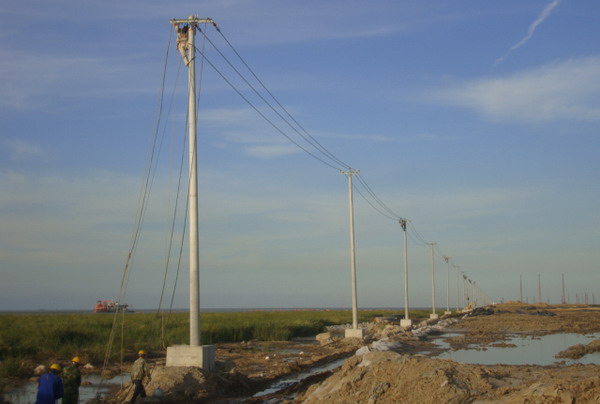 連云新城三期供電線(xiàn)路緊貼海堤邊。受海堤建設進(jìn)度和海風(fēng)海潮的影響,低矮的壩堤經(jīng)常被風(fēng)刮起的海浪浸頂,石塊突起,洼水漣漪,淤泥纏足,堤邊路面凹凸不平,道路僅限一輛車(chē)通行,擁擠不堪,工程施工難度極大。為提升速度,加快進(jìn)度,臺北供電所克服困難,緊鑼密鼓地展開(kāi)工作,以期早日完工?,F場(chǎng)勘察地形地貌,了解潮汐運動(dòng)規律,制定施工計劃,設計措施方案,組織人力,采購材料,投入施工。施工人員采用彈性工作時(shí)間,利用落潮時(shí)機,搶運電桿,及時(shí)立桿和裝配。職工們發(fā)揚不怕苦,不畏難的精神,不懼海風(fēng)吹臉、海水浸衣,爬上距離海平面二十多米仿佛搖擺不定的高桿,懸在空中一絲不茍地操作,保障了工程的全面竣工。