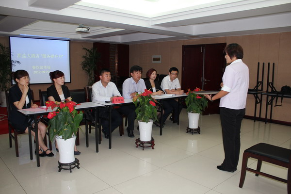 10月12日,淮鹽大酒店“服務(wù)提升月”主題活動(dòng)圓滿(mǎn)結束。經(jīng)逐個(gè)考核參訓員工,結果令人滿(mǎn)意,達到了預期效果,為下一步的“出品質(zhì)量月”活動(dòng)開(kāi)了個(gè)好頭。