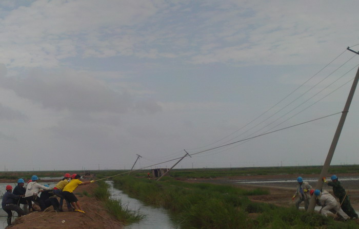 8月3日天剛亮,大家都顧不上休息,立即分片趕到受災現場(chǎng)巡視情況。東港工區洋井口8根高壓桿被刮倒,大瑞頭圩、二圩、新灘口和方南、嚴港等工區30多根低壓桿被刮歪,有的倒在了格堰上,情況十分危急。搶修人員立即作了停電應急處理,確保安全。