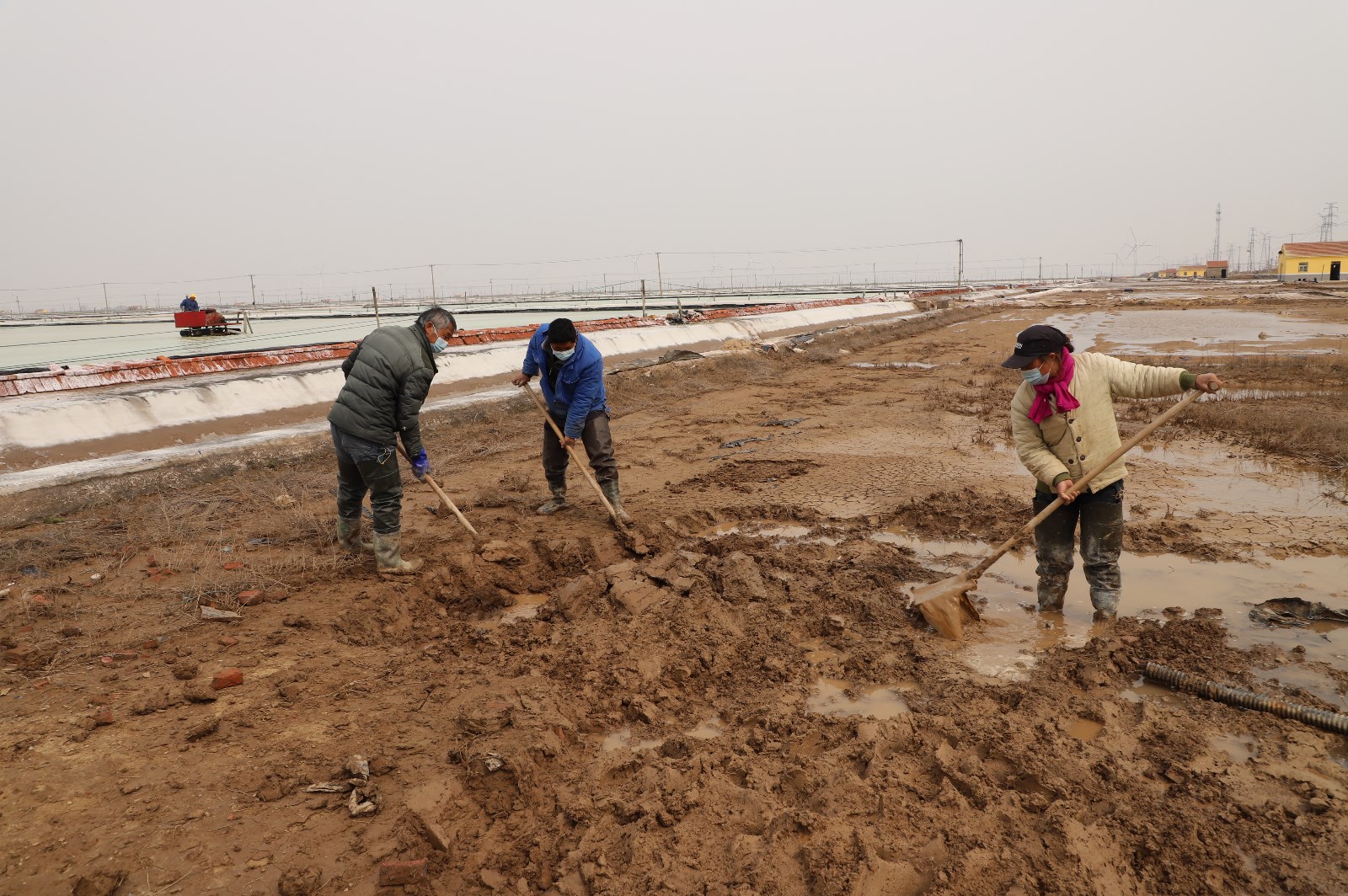 3月28日清晨,在通往日曬制鹽新河、埒南分公司入口處,戴著(zhù)口罩的工人們依次接受測溫、亮碼、登記,有序進(jìn)入各生產(chǎn)班組。灘頭上,工人們分散作業(yè),忙著(zhù)修補塑造、整理廩基……無(wú)論是從灘頭到塘頭,還是從碼頭到田頭,處處都呈現出熱火朝天、大干快上的場(chǎng)景。