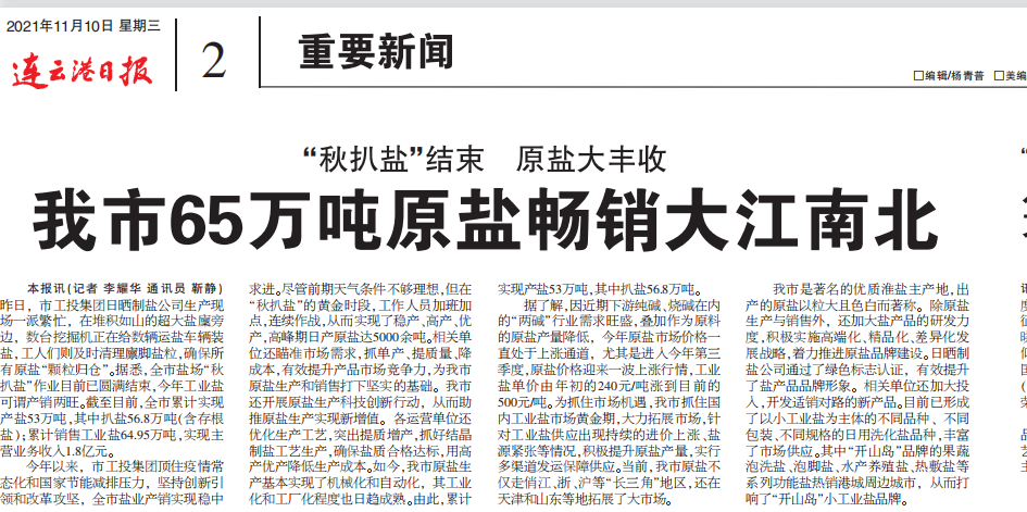 連云港日報刊登:我市65萬(wàn)噸原鹽暢銷(xiāo)大江南北