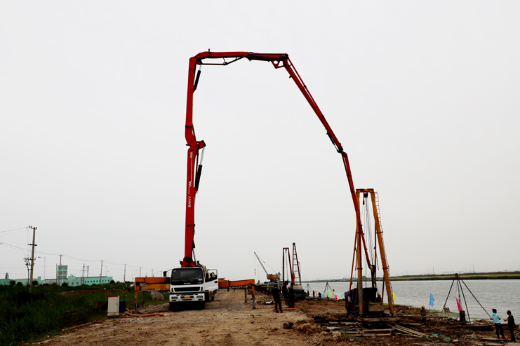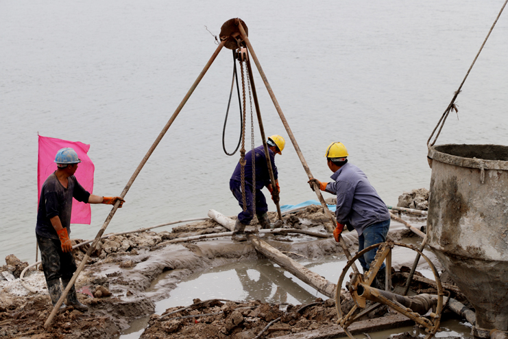 5月30日下午,藍色的天空沒(méi)有一絲云彩,火熱的太陽(yáng)炙烤著(zhù)大地。在灌西投資公司五灌河碼頭擴建項目建設工地,施工人員正在各司其職的工作著(zhù),有的在使用電鋸,有的在壓鋼筋,還有的在焊接鋼筋框架。遠處一臺混凝土澆灌機在進(jìn)行混凝土澆灌作業(yè),碼頭岸邊大小打樁機器一字排開(kāi),筆者親身感受五灌河碼頭二期工地開(kāi)發(fā)建設的火熱場(chǎng)面。