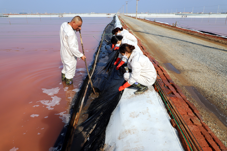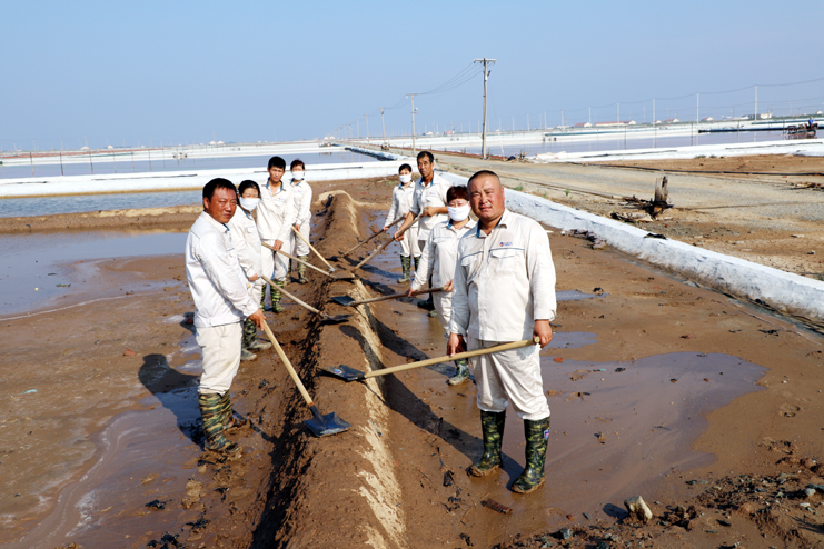 8月9日,室外溫度36攝氏度,地面溫度43攝氏度。上午6點(diǎn)半,筆者來(lái)到新河制鹽分公司八班,恰逢工人在修整鹽稟。筆者看到,8班班長(cháng)祝星星拿起鐵鍬,帶領(lǐng)幾名員工在高溫下挖溝取土修稟基,沒(méi)干一會(huì )就有大滴的汗水從他的面頰掉落,盡管汗水布滿(mǎn)面頰,但工人們的動(dòng)作幅度絲毫不減,稟基在他們的修整下整齊劃一,一幅鹽灘工人戰高溫、奪高產(chǎn)的美麗畫(huà)卷呈現在眼前。