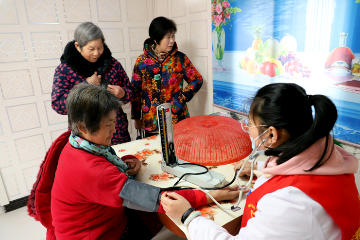 首先走訪(fǎng)的是中二圩社區退休老職工施長(cháng)法,這位慈祥的老人,給人第一印象:一根根銀絲一般的白發(fā)在黑發(fā)中清晰可見(jiàn),微微下陷的眼窩里,一雙深褐色的眼眸,悄悄地訴說(shuō)著(zhù)歲月的滄桑。從進(jìn)門(mén)的那一刻起,他的臉上就一直掛著(zhù)微笑,讓人如沐春風(fēng)。社區主任宋新來(lái)介紹說(shuō):“這是我們的市勞動(dòng)模范,退休25年來(lái)一直免費幫街坊鄰居修補鞋子、拉鏈以及自行車(chē)等,贏(yíng)得了社區群眾的愛(ài)戴和敬佩”。在志愿者做好基本信息登記后,為老人測量了血壓,進(jìn)行了心臟聽(tīng)診,發(fā)現老人血壓比較高,并叮囑老人要按時(shí)吃降壓藥,如果感覺(jué)身體哪里不舒服,要及時(shí)上醫院就診。“歲數大了,記性不好,早上降壓藥忘記吃了,幸虧你們上門(mén)來(lái)看,要不今天就不舒服了。”中二圩社區退休老職工施長(cháng)法跟志愿者說(shuō)。