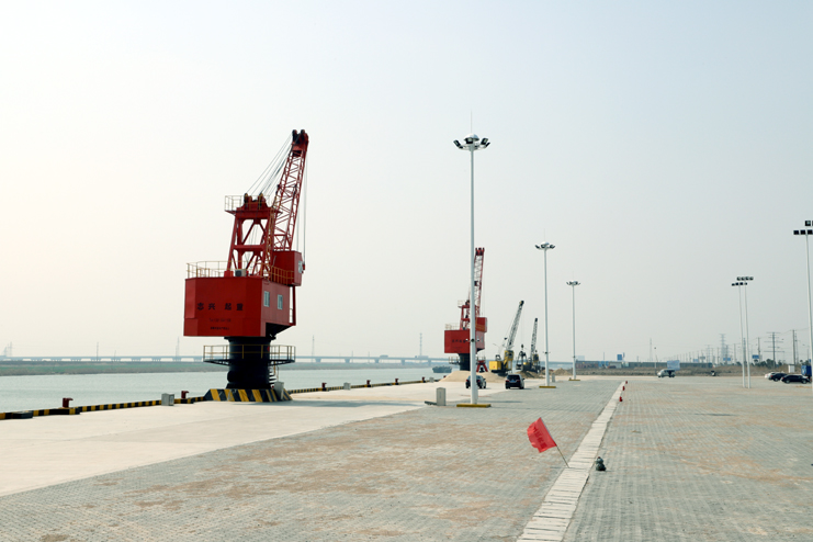 在五灌河碼頭現場(chǎng),302米長(cháng)的碼頭平臺上,2座20多米高的紅色座吊一字排開(kāi),在河水的映照下顯得格外“威武”。據碼頭工作人員介紹,這兩座吊機剛剛安裝并調試完畢,它們是五灌河碼頭運營(yíng)的最基本條件之一,一座25噸,另一座40噸,運出貨物將通過(guò)這兩座吊機完成。