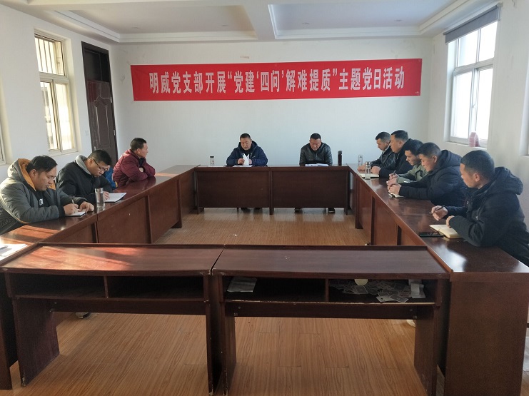 12月22日上午,明威黨支部在三樓活動(dòng)室開(kāi)展“黨建‘四問(wèn)’解難提質(zhì)”主題黨日活動(dòng)。明威黨支部書(shū)記葛高平主持座談,13名黨員及入黨積極份子參加?,F場(chǎng),書(shū)記葛高平首先傳達了投資公司黨委《關(guān)于開(kāi)展“黨建‘四問(wèn)’解難提質(zhì)”主題黨日活動(dòng)的通知》的文件精神。與會(huì )黨員和入黨積極份子認真學(xué)習文件精神,積極參與討論。