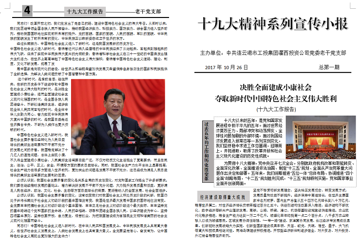 10月27日,灌西投資公司黨的十九大精神第一次學(xué)習會(huì )議上提出五確保,即確保學(xué)習入腦入心;確保領(lǐng)會(huì )認真準確;確保宣傳宣講生動(dòng);確保十九大結合實(shí)際;確保干好當前。在投資公司黨委的帶領(lǐng)下,老干黨支部掀起了學(xué)習貫徹黨的十九大精神的熱潮,重在學(xué)懂、弄通、做實(shí)上下工夫。