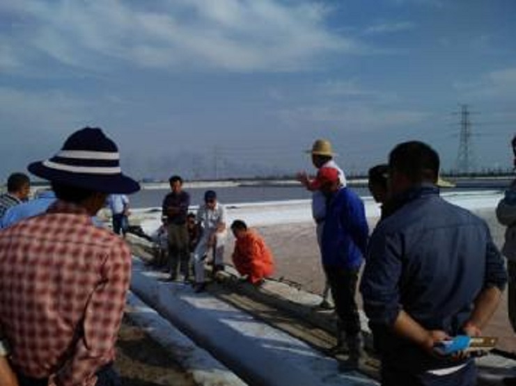 該分公司一班人帶著(zhù)十六名班長(cháng),到新河零班做加鹵“天溝”工作現場(chǎng)。剛到目的地,站在打好的溝頭,一眼望去,二條溝口線(xiàn)筆直,和熟捯實(shí)的粘埝泥輕而易舉承載著(zhù)人的重量。此條加鹵“天溝”嚴格按日曬制鹽公司規格標準而建,溝長(cháng)約210米,上口寬55cm,下口寬30cm,溝深45cm,溝底坡勢順沿三排到頭排由淺至深。做好的一條加鹵溝, 可以為六塊結晶池扒鹽期間分別添加鹵水,減少洗鹽鹵水進(jìn)其它池塊的二次污染。