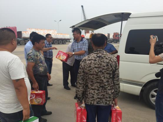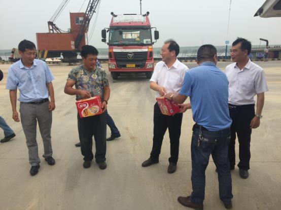 2017年7月18日星期二下午灌西鹽場(chǎng)投資公司領(lǐng)導到宵洋物流有限公司碼頭送清涼看望一線(xiàn)員工!在黨委書(shū)記董事長(cháng)王德志同志、總經(jīng)理李國文同志、工會(huì )主席王保平同志的帶領(lǐng)下親自到我宵洋物流有限公司碼頭看望一線(xiàn)員工,送清涼。炎炎夏日,酷暑當頭一線(xiàn)員工永遠沖鋒在前,領(lǐng)導的關(guān)懷更是永不停止!宵洋物流全體員工致謝?。ㄏ笸跞唬?br />
