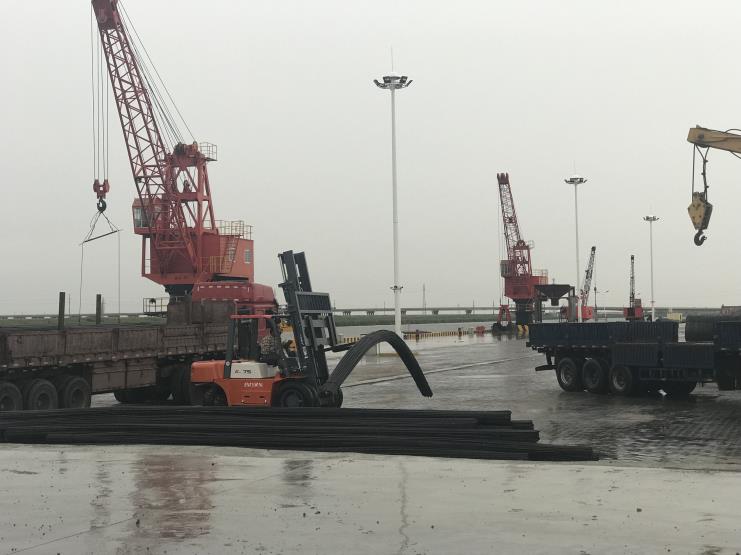 “戰高溫,迎酷暑”,宵洋碼頭從早上開(kāi)始就忙得如火如荼。裝載管樁的貨船進(jìn)入碼頭,工人們就開(kāi)始操作著(zhù)塔吊,穩穩當當的將管樁“放”入貨車(chē)。貨車(chē)裝載的盤(pán)螺,鋼筋也紛紛到碼頭場(chǎng)地上裝卸。一切工作都井然有序的進(jìn)行著(zhù)。