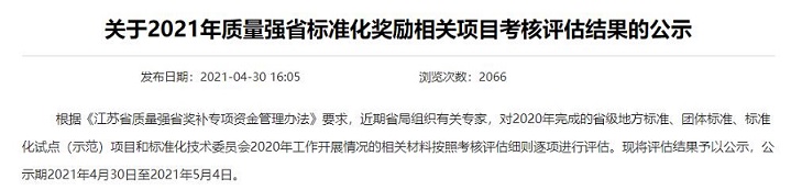 網(wǎng)址鏈接:江蘇省市場(chǎng)監督管理局 綜合通知 關(guān)于2021年質(zhì)量強省標準化獎勵相關(guān)項目考核評估結果的公示 (jiangsu.gov.cn)