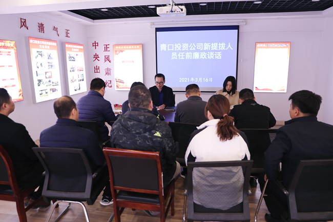 ? ?3月16日下午,青口投資公司紀委書(shū)記朱文兵對九名新提拔人員進(jìn)行任前集體談話(huà),相關(guān)人員參加了此次會(huì )議。? ? ? ? ? ? ? ? ?