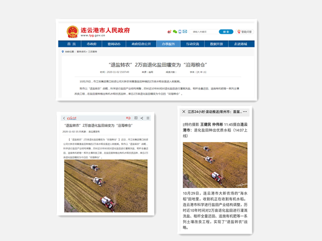 今年收割期間,人民網(wǎng)、光明網(wǎng)、江蘇24小時(shí)、連云港市人民政府網(wǎng)、連云港日報連續報道了我公司鹽堿地水稻豐收、秸稈綜合利用等工作舉措。我公司在現代農業(yè)發(fā)展和生態(tài)文明建設中取得的成就受到了媒體廣泛關(guān)注。(青宣)